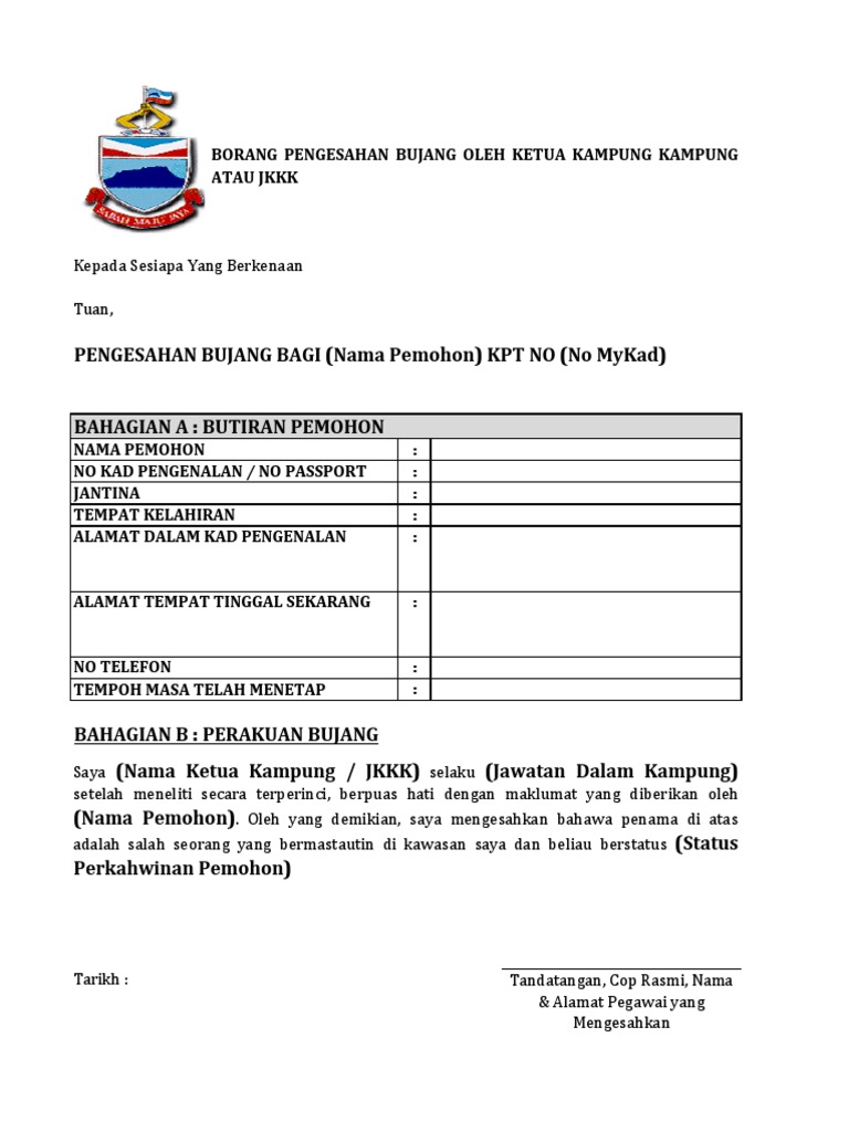 Borang Pengesahan Bujang Oleh Ketua Kampung Kampung Atau Jkkk Pdf